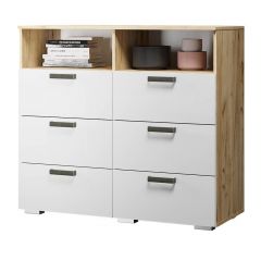 Особый шарм комодам «Мегаполис» придают трендовые цветовые решения фасадов, которые идеально вписываются практически в любой стиль. Оригинальная фрезеровка и эксклюзивная фотопечать выглядит очень эффектно и эксклюзивно. Пыли и грязи на таких поверхностях совершенно не видно, а это огромный плюс для домохозяек! Комод (КМ-15) выдержан в общей стилистике «Мегаполис» и состоит из двух распашных по бокам и трёх выдвижных по центру вместительных ящиков на шариковых направляющих с удобной системой хранения. Полезное пространство распашных ящиков разделены полками.