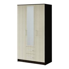Красивая классическая модель трёхстворчатого шкафа Фиеста прекрасно впишется в интерьер спальни или гостиной. Центральная створка у модели – зеркальная, под ней находятся два выкатных ящика. Внутренняя комплектация состоит из отделений с хромированными штангами и зоны с полками для хранения трикотажа или белья. Шкаф выполнен в комбинации цветов венге и лоредо.
